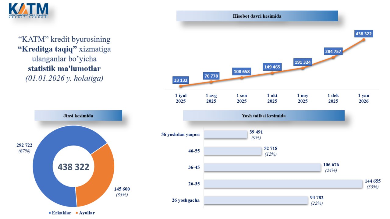 2026-yil 1-yanvar holatiga ko‘ra, mazkur xizmatdan 438 ming 322 nafar fuqaro foydalandi. Bu haqda Kredit-axborot tahliliy markazi (KATM) ma’lumot berdi.