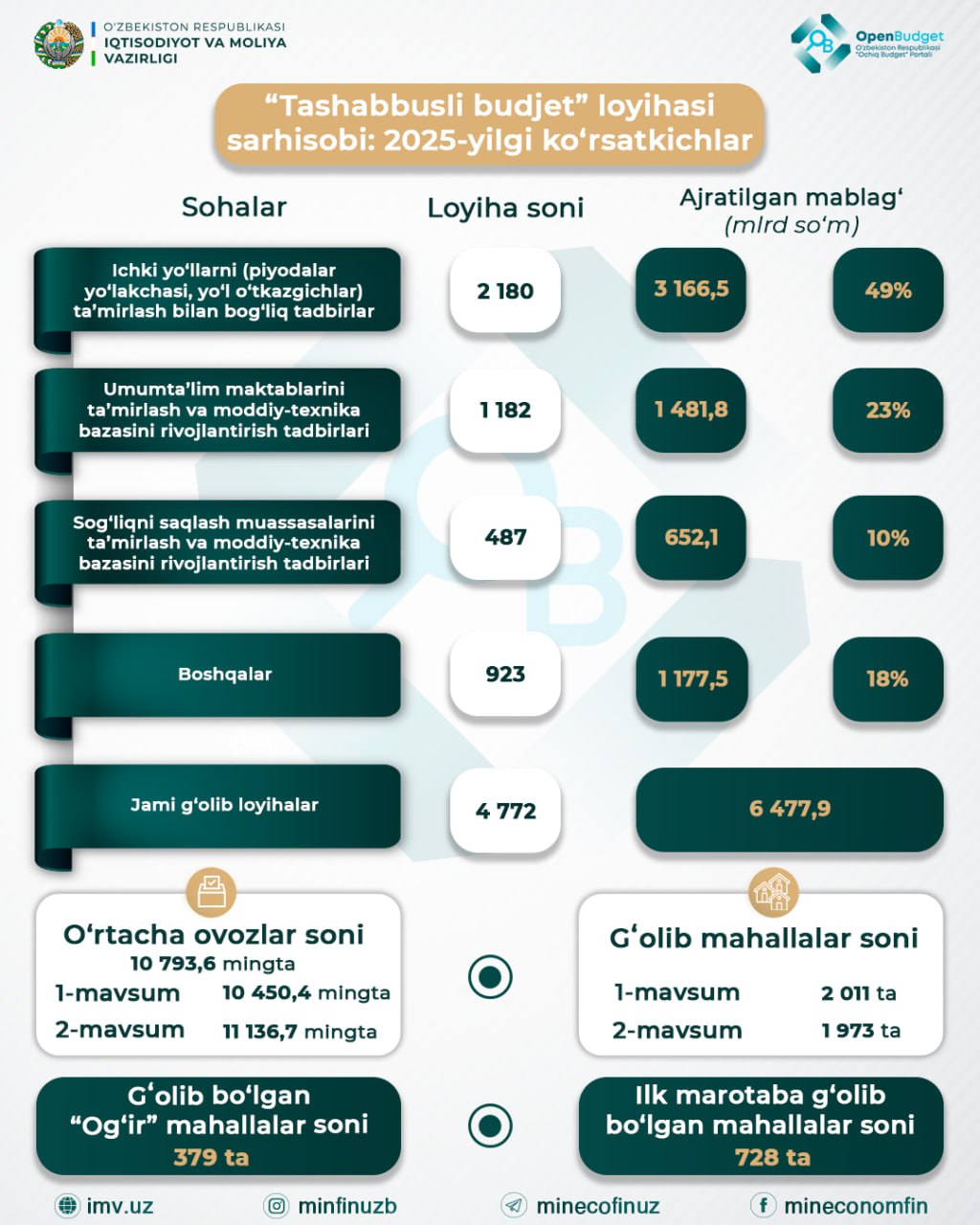 2025-yilda Tashabbusli budjet doirasida jami 3 ming 984 ta mahalla g‘olib bo‘ldi. Ularning 728 tasi birinchi marta g‘oliblikni qo‘lga kiritdi.