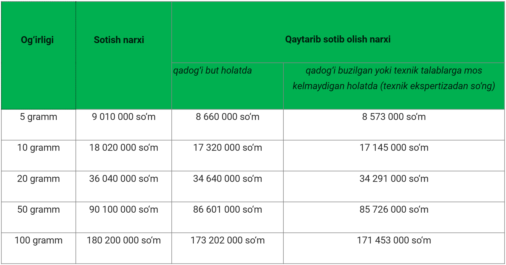 2026-yil 12-yanvar holatiga ko‘ra, O‘zbekistonda 1 gramm oltin quymasi 1 mln 802 ming so‘mdan sotilmoqda. Bu rekord ko'rsatkichdir.