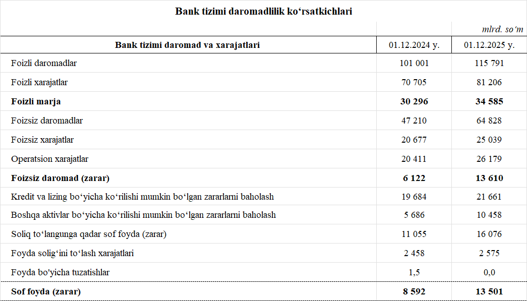 Ushbu davrda banklar 13 trln 501 mlrd so‘m sof foyda olishga erishdi. Bu o‘tgan yilning mos davriga nisbatan 4,9 trln so‘mga yoki 57 foizga ko‘pdir.