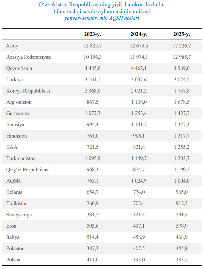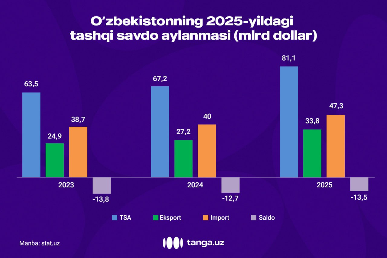 2025-yilda O‘zbekistonning tashqi savdo aylanmasi (TSA) 81,2 mlrd dollarni tashkil etdi.