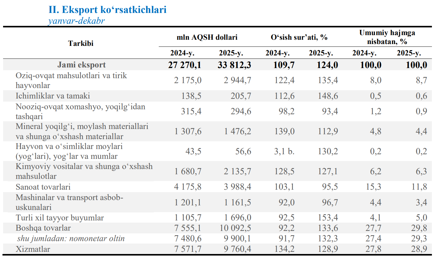 2025-yilda O‘zbekistonning eksport hajmi 33,8 mlrd dollarni tashkil etdi. Bu 2024-yilga nisbatan 6,5 mlrd dollarga yoki 24 foizga ko‘pdir.
