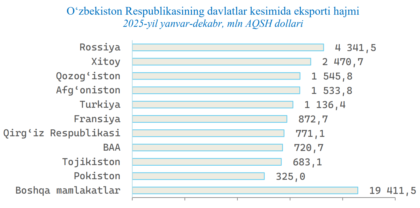 2025-yilda O‘zbekiston eng ko‘p Rossiyaga mahsulot va xizmatlarni eksport qildi. Bu ko‘rsatkich 4,34 mlrd dollarga teng bo‘lib, jami eksportning 12,8 foizini tashkil etadi.