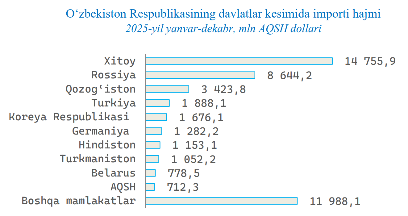2025-yilda O‘zbekistonning import hajmi 47,4 mlrd dollarni tashkil etdi.